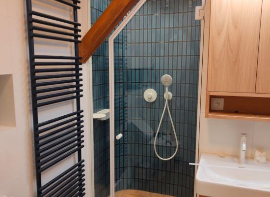 Od dne objednávky celá zakázka včetně montáže trvala necelý měsíc. Výsledkem je elegantní kombinace masivního trámu a krásného sprchového koutu s originálním tvarem dveří. Ostatně posuďte sami.